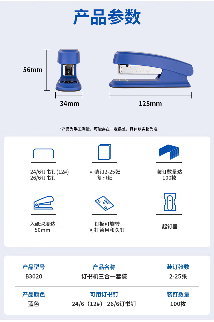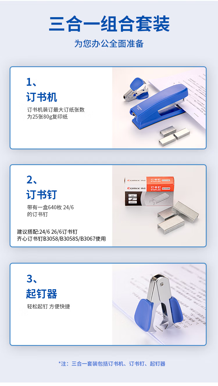 齐心(Comix)订书机套装(订书器+订书钉+起钉器) 12# 蓝 办公文具工具B3020 自营